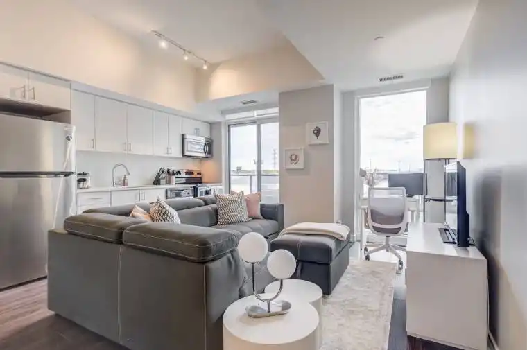 Step into this bright and beautifully refreshed 1-bedroom suite. The open-concept layout flows effortlessly, featuring sleek laminate floors, a contemporary kitchen with stainless steel appliances, and thoughtful upgrades throughout, including a brand new fridge, custom blinds, updated cabinetry, chic light fixtures, and freshly painted walls. Enjoy your morning coffee or unwind after work on the private balcony overlooking this vibrant community. Just steps to the TTC Lakeshore streetcar, Mimico trails, parks, cafés, and shops and only minutes from downtown Toronto.