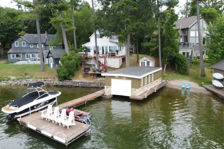Spectacular 4-Season Lakefront Home on Sandy Beach – Chemong Lake south of the Causeway. Welcome to lakeside living at its finest! This beautiful 4-season home is nestled on a sandy beach and armour stone along Chemong Lake, part of the Trent Severn Waterway. Boasting 74 feet of pristine waterfront, crystal clear waters, and breathtaking western sunsets, this property offers the ultimate in relaxation, recreation, and year round enjoyment. Set on a generous 74′ x 204′ (irregular) lot, this home features 3 bedrooms, 2 bathrooms, and a stunning sunroom with panoramic lake views. The open-concept kitchen, dining, and living area is warm and inviting, complete with a woodstove insert-perfect for cozy evenings after a day on the water. Outdoors you’ll love the renovated wet boathouse, 4-sleeper bunkie, and extensive dock system, ideal for entertaining, swimming, boating, or simply soaking in the sun. A wrap around front deck complete the picture – an ideal space to take in the view or gather with friends and family. Located south of Chemong Causeway, you’re just a short walk to the village, and minutes to shopping, churches, a community centre, pharmacy, and only 8 minutes to town.