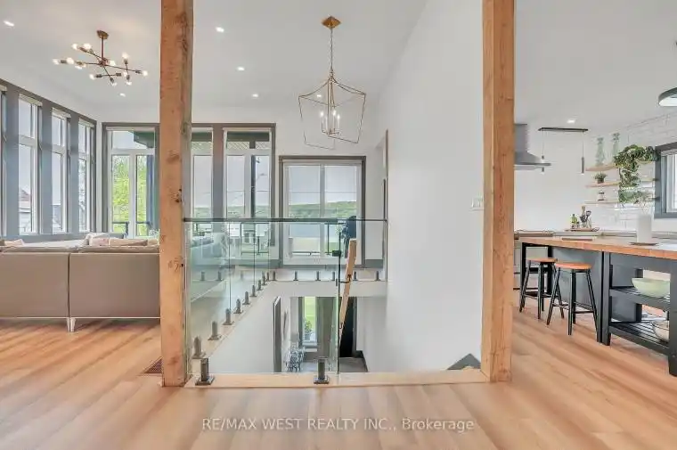 Modern Luxury with Scenic Harbour Views. Just Steps from the Beach. Experience refined coastal living in this exceptional 2,400 sq. ft. modern residence, ideally located just a 3-minute stroll from the beach and showcasing captivating southwest views of Penetang Harbour. Thoughtfully designed with 4 spacious bedrooms (3 on the main floor and 1 on the second floor, now being used as a gym, but could be home office or flex space) and 2.5 elegant bathrooms, this home features an airy open-concept layout highlighted by soaring 12-foot ceilings in the great room, 9-foot ceilings throughout, and premium finishes at every turn. The heart of the home a gourmet kitchen with stainless steel appliances flows seamlessly into the dining and living areas, complete with a cozy fireplace and walkout to a covered balcony perfect for sunset views. Retreat to the serene primary suite featuring a spa-inspired ensuite with a walk-in glass shower. Additional features include radiant in-floor heating on the ground level, modern lighting with designer Kusco fixtures, $10,000 in custom window coverings, 8-foot doors, and custom baseboards throughout. Practicality meets style with inside access to a single-car garage, a well-appointed mudroom/laundry space, and multiple outdoor living areas including three decks and a generous backyard. This is coastal elegance at its finest where every detail has been carefully curated for modern comfort and relaxed sophistication.