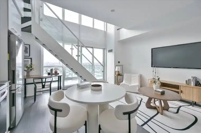 Step into Breathtaking Views from this sun-drenched, west-facing Penthouse unit, featuring dramatic 17ft ceilings with floor-to-ceiling windows. This striking two-story loft offers 720 sq. ft. of thoughtfully designed, open-concept living. The main floor presents a generous living and dining area, an elevated open kitchen with premium built-in stainless steel appliances, a two-piece powder room, and a private walk-out balcony that boasts an expansive view with sparkling lake views. A versatile nook beneath the stairs is ideal for a desk or pantry. The upper level is a luxurious master retreat, complete with custom his-and-hers closets with built-in organizers and a spa-like ensuite featuring a separate shower and soaker tub. This exceptional layout is perfect for a single or couple desiring ample space for a sophisticated work-from-home setup.Take advantage of resort-like facilities including: 24 hr concierge, full gym, party room, outdoor pool, rooftop deck with bbq’s, games room, media room, sauna, and squash courts, bike storage and guest suites. Prime Mimico location: 3 min to the Gardiner Exp, 5 min drive to Mimico GO. Walk to the waterfront, walking trails, stores, groceries, public transit. One parking spot included. Floor plans attached. Check out the virtual tour!