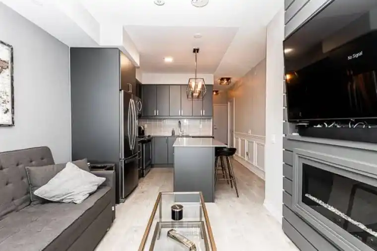 Come & Enjoy Luxurious Custom Built Details In This Perfectly Laid Two Bedroom, Two Full Bathroom Stunning East Facing Unit. Custom Wainscoting Details In The Living Room & Master Bedroom, Cozy Fireplace, Brand New Stylish Electrical Light Fixtures Throughout The 700 Sq Ft Unit, 9′ High Ceilings, Quartz Counter Top, Tile Backsplash, One Parking And Locker Included. Available Furnished Or Unfurnished. The Second Bedroom Has A Custom Built Door (No Closet/No Window) But Is Beautifully Set Up As A Cozy Bedroom. The Area Is Booming, Moments Away From The New Subway Station, Costco, York University, Everything You Need To Live Happy!