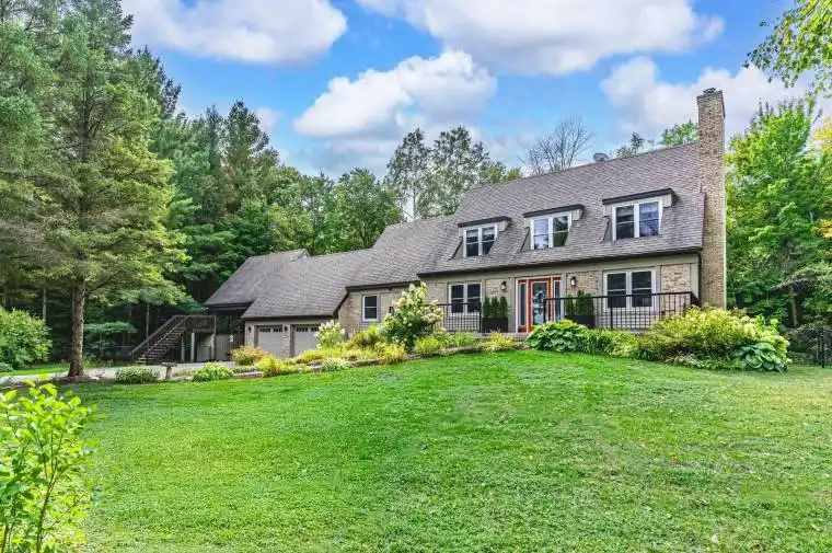 THE PROPERTY THAT TURNS “WHAT IF” INTO “THIS IS IT!” This is the listing that makes every other tab on your browser look boring. Settled on 2 private acres wrapped in mature trees, this home finally gives everyone breathing room, with a walkout basement offering real in-law potential and a loft teens will claim long before they have earned the rent they think they are paying. The brick exterior, dormer windows, long driveway, and landscaping set the tone, leading to a layout filled with warmth and personality. The kitchen could live on Pinterest with wood and white cabinets, a subway tile backsplash, high end appliances including a side-by-side fridge and freezer, and more cabinetry than you will ever run out of, which means your next Homesense run will be less about storage solutions and more about how you want to style your new favourite space. The living room brings charm with French doors and a fireplace, while the family room adds character through exposed beams, another fireplace, and a walkout to a fenced yard with a flagstone patio overlooking the pond and trees. A sunroom wraps you in peaceful views and the main-floor office gives you the quiet zone everyone needs. The second level unfolds into a sitting area that feels made for slow mornings or late-night talks, leading to a primary retreat with an ensuite and additional bedrooms that offer comfortable places to recharge at the end of the day. The walkout basement opens up endless flexibility with a kitchen, rec room, bedroom, den, gym, and bathroom that make multi-gen living feel simple. The loft above the garage elevates the setup with vaulted ceilings, skylights, exposed beams, a private deck, and its own staircase to the yard, ideal for a creative zone, or that friend who always stays longer than planned. Geothermal heating, a triple-wide driveway, an insulated 2 car garage, and a water softener complete a property that delivers the kind of life people mean when they say they want “more.”