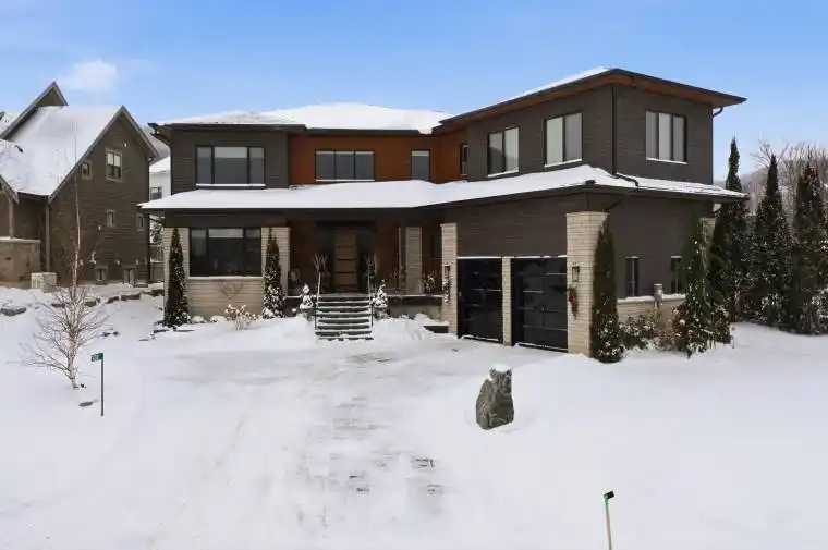 Featuring over 7,000 sq. ft. of pristine living space this custom-built home in the Nipissing Ridge community offers luxury mountain living at the base of Alpine Ski Club and Craigleith. Steps from skiing, hiking, and the shores of Georgian Bay, and minutes to the boutiques, restaurants, and golf courses of The Blue Mountains, it blends year-round recreation with upscale comfort. The 20-foot ceiling great room features expansive windows framing mountain views and a 48-inch linear gas fireplace. The chef’s kitchen is equipped with a quartz waterfall island, prep area, beverage station, and premium appliances including a 48-inch Monogram gas range and fridge, Miele dishwasher, wine cooler, and beverage fridge. The main floor primary suite provides a private retreat with a floating vanity, double sinks, glass-enclosed double shower, freestanding tub, heated floors, and a custom dressing room. Engineered hardwood floors, a pre-wired sound system, and a dedicated office enhance everyday living. Upstairs offers a family/games room and three bedrooms, each with an ensuite. The finished lower level includes a family room, games area, two bedrooms, additional bathrooms, in-floor heating, and durable vinyl flooring. Exterior features include stone and wood finishes, an 8-foot glass-paneled entry door, and 9×9 garage doors with a lift system. Move-in ready, this is a rare opportunity to enjoy an active, four-season lifestyle in one of the areas most sought-after communities.