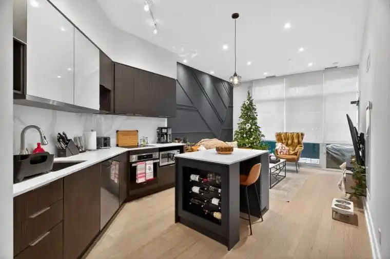 Luxury Ground-Floor 1 Bedroom Suite – Fully Renovated & Move-In Ready. This stunning, fully upgraded 1 bed, 1 bath residence features 10 ft ceilings, hardwood floors throughout, full floor-to-ceiling windows. Feature walls in both the living and primary bdrm. Throughout the unit, dual roller blinds offer total control, sheer shades for natural daylight and full blackout rollers for complete privacy and restful nights. Premium Miele S/S appliances, sleek kitchen island w/ waterfall countertop and built-in wine rack, new doors/trim, and pot lights on dimmers throughout. Spa-quality bathroom with upgraded tiles, rainfall shower + handheld, granite vanity top with built in sink, and luxury finishes end to end. Enjoy a rare private ground-floor terrace with composite decking, green feature wall, and LED perimeter lighting-perfect for summer. This ground floor unit lets you skip the elevator waits and enjoy direct, effortless access every day, while still having an elevated balcony overlooking the Shops at Don Mills. This suite also comes with a locker and a Tesla-charging parking spot, a rare upgrade! Tenant pays only hydro. One of the most luxurious units in the building, a must-see!