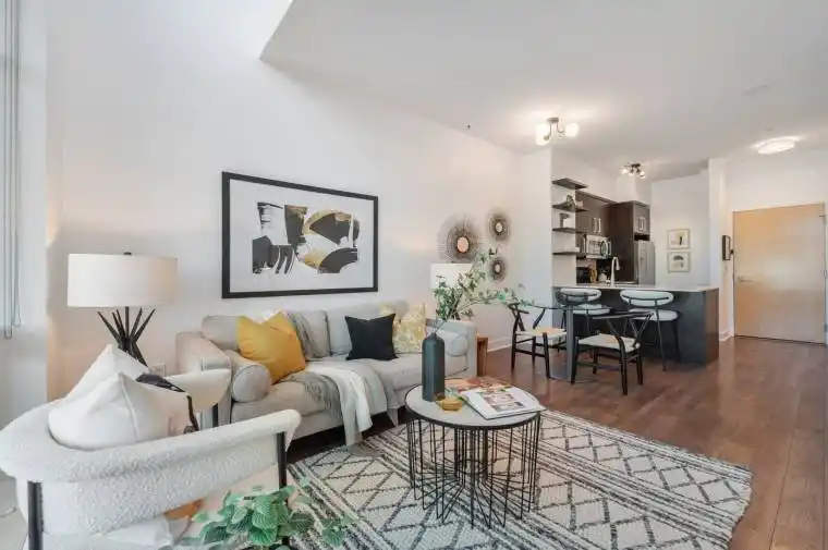 Townhouse-style living meets condo convenience in this spacious 1 bedroom + den, 2 bathroom end unit at 1048 Broadview Ave. With nearly 800 sq ft, soaring 20′ ceilings, and dramatic two-storey windows, the space feels bright and airy. The main level offers an open-concept living/dining area, kitchen with breakfast bar, convenient powder room, and rare dual entrances with direct street access or through the building. Upstairs, the bedroom features double closets, a renovated ensuite bath, and an open den perfect for a home office. Freshly painted with plenty of bonus storage throughout, plus parking and locker included. Steps to groceries, TTC, and the many shops and restaurants along The Danforth.