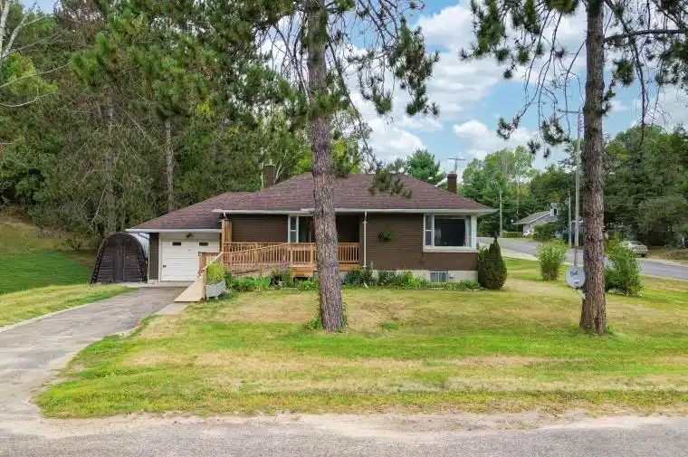 3 bed 2 bath Bungalow on large lot with mature yard and 1 car garage located on a quiet .22 Acre Lot close to town and the beautiful York River which offers trails to walk, snowbmobile or ATV into town! This full brick bungalow offers recent updates including Central Air and Quartz Counter tops / island in the kitchen along with recently updated stainless steel appliances. Enjoy the oak hardwood floors throughout living room and bedrooms, 200 amp electrical service and 220v in the Garage ready for your tools or EV Charger! The main floor master bedroom offers 2 closets and there is a closet in the other 2 main floor bedrooms. Massive Corner window in the main floor living room offers lots of natural light, ideal for entertaining. Partially finished basement with 2pc bathroom and large recreation room with fireplace rough in (capped) with stone mantle. Newer front deck with ramp offers convenience for people or pets with mobility issues. Convenient side entrance could lend itself to a future separate basement apartment or multi family living. Walking distance to all Bancroft amenities from this fantastic bungalow! Water heater 2021, Propane Furnace 2018. Great cell service from this location along with high speed internet, garbage and recycling pick up. View Floor Plans attached to listing and full iguide linked to listing.
