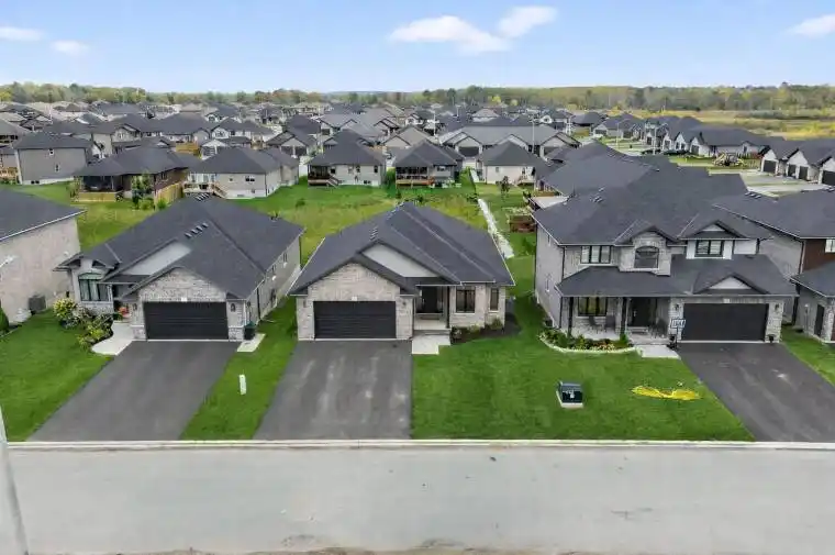 Move-in ready and FULLY FINISHED! This 5 bedroom, 3 bathroom Quinte model all brick bungalow by Duvanco Homes sits on a PREMIUM lot on cul-de-sac backing onto green space, offering privacy and peaceful views. Designed with modern living in mind, the open-concept layout features a custom quality kitchen with oversized island, coffered ceiling in the living room and distressed wide plank hardwood throughout the main floor. Modern light fixtures and finishes throughout. The primary suite includes a walk-in closet and luxurious ensuite with double vanity and glass-surround porcelain tile shower. Main floor laundry with access to the attached garage. Lower level finished with 2 bedrooms, 4pc bathroom and recreation room. Exterior landscaping complete with paved driveway, fully sodded yard, garden package and stone walkway. Completed pressure treated deck with black ballisters. This Quinte model home is Holmes Approved. Settlers Ridge Subdivision offers trails, park, asphalt paved sidewalks, green space and is just minutes to all amenities.