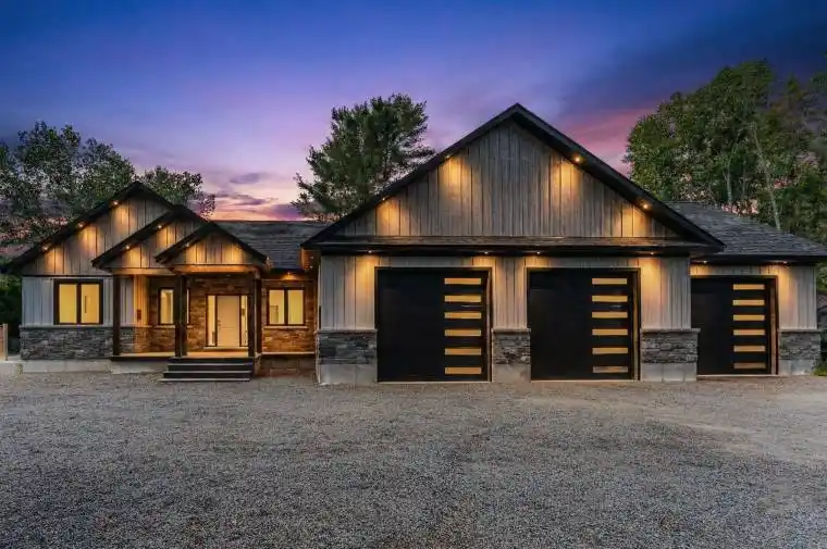 GORGEOUS NEWER BUNGALOW ON 1 ACRE, NEARLY 2,600 FINISHED SQ FT, HEATED, INSULATED & DRYWALLED TRIPLE GARAGE, 7-PERSON HOT TUB & 600 SQ FT DECK! Built in 2022, 24B Buck Hill is turning heads with stone accents, vinyl siding, bold peaked roof lines, black-framed windows, and soffit lighting that steals the show at dusk. The attached triple-car garage spans nearly 1,500 sq ft, heated, insulated, and drywalled, built with 12-foot ceilings, 220-volt welder plugs, LED strip lighting, and three modern 10 ft x 10 ft doors powered by side-mounted LiftMaster Wi-Fi openers. Step inside and the great room makes an immediate impression, a wood-plank vaulted ceiling soaring above a dramatic wall of windows that brings the outdoors into every hour. The kitchen keeps things social and current with quartz countertops, a central island designed for conversation, a tile backsplash, and updated stainless-steel appliances. The main-floor primary bedroom offers a calm, private retreat with a 5-piece ensuite featuring a soaker tub, walk-in shower, dual sinks, and a stand-up shower. Two additional bedrooms and a full bathroom create quiet pockets for family and visitors, the main-floor office earns its place for uninterrupted work, and a laundry room plus a powder room complete a layout that simply works. The basement remains untouched, offering a separate entrance from the garage and a partially completed 3-piece bathroom, giving future owners a head start on flexible guest space or private living quarters. Less than 10 minutes from downtown Bancroft for gas stations, restaurants, grocery stores, schools, parks, medical services, and daily essentials, this #HomeToStay makes every arrival feel like something worth looking forward to.