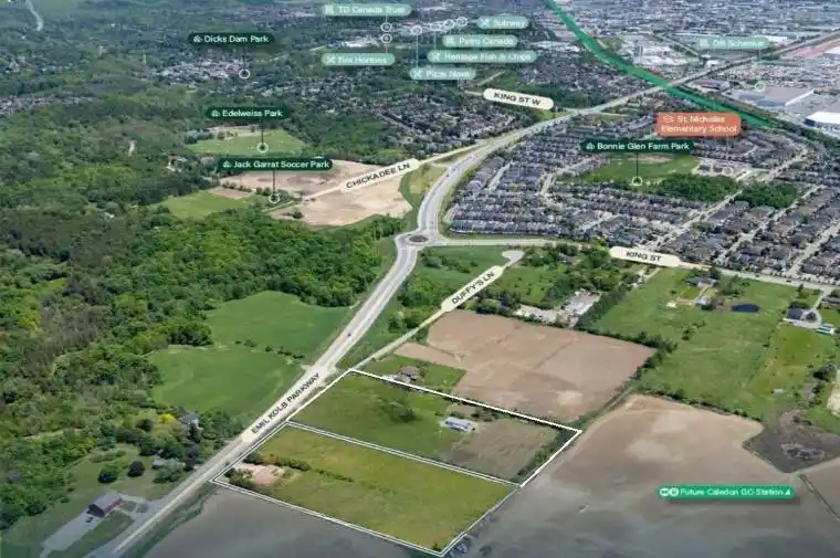 Prime Approx 5 Acre Residential Development Opportunity. Total Parcel Can BE Approx. 10 Acres By Adjoining Neighboring Parcel. Prime infill residential opportunity within Caledon’s Phase 1 Growth Area Near-term development potential with infrastructure expected by 2026-2027Adjacent to existing communities enabling logical expansion. Water & Wastewater Servicing: Expected 2026-2027Close to Future Caledon GO Station North of existing residential development. Within Phase 1 Community Area under Caledon’s Growth Management Plan Municipal servicing aligned with 2026-2027 timeline Included in ROPA 2051 for residential expansion Excellent road connectivity & proximity to future GO Station Flat, rectangular sites ideal for subdivision planning. Both Parcels Have Existing 2 Homes With Luxury Finishes.