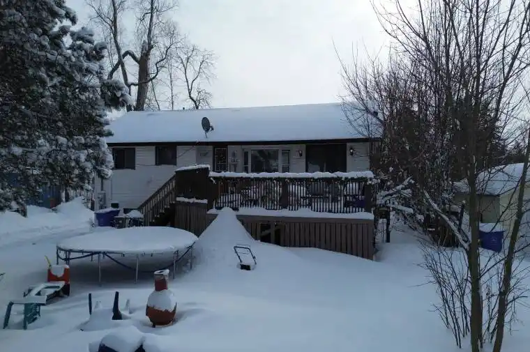An excellent opportunity for first-time buyers, investors, or those seeking a mortgage-helper property in a desirable waterfront community.Exceptionally located raised bungalow on a large lot with private beach rights. This home features a walkout from the primary bedroom to a spacious 16′ x 21′ deck, soaring cathedral ceilings, and a bright, functional kitchen filled with natural light.The lower level offers strong rental potential, featuring a roughed-in kitchen, full bathroom, and two bedrooms, making it suitable to be rented separately for additional income or used for extended family living.A detached double-car garage with hydro completes the property. “SOLD AS IS” UNDER POWER OF SALE