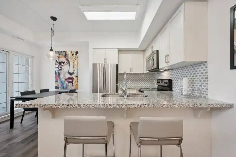 This beautifully renovated 1-bedroom plus den condo presents 911 sq. ft. of thoughtfully designed living space with a sophisticated, modern feel. The kitchen, featuring timeless white cabinetry and elegant granite countertops, opens to a designated dining area and a bright living room with large windows that draw in natural light. From the dining area, step out to your private balcony, perfect for enjoying your morning coffee or unwinding at the end of the day. The spacious primary bedroom is complemented by a stylish 3-piece ensuite, while the well-proportioned den offers versatility as a home office or guest room, paired with a convenient powder room. Additional highlights include new flooring throughout, in-suite laundry, a surface parking spot, and a locker for extra storage. Perfectly situated close to the University of Guelph and within easy access to HWY 401, this residence combines upscale finishes with everyday convenience, making it an outstanding option for professionals, students, or commuters alike.