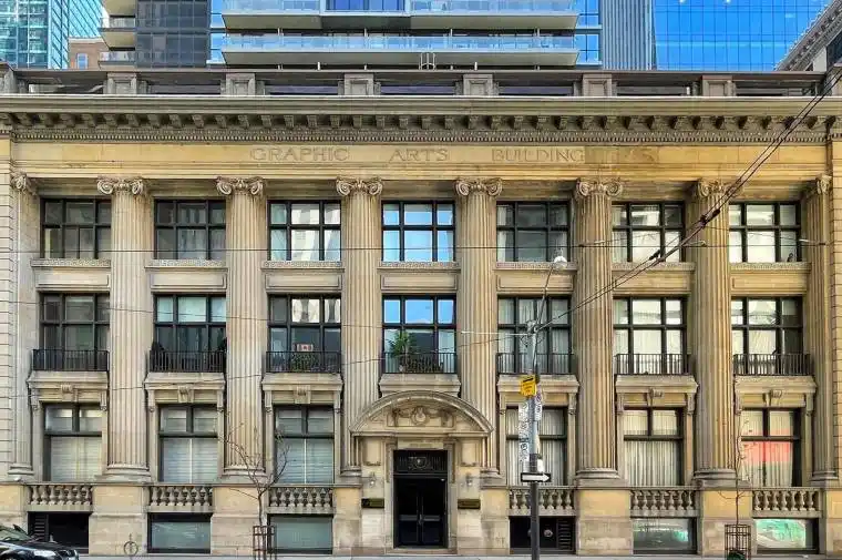 Location, location, location! Welcome to the iconic Graphic Arts Building-a rare, heritage boutique building in the heart of Toronto’s Financial District. Originally built in 1923 and converted to condos in 2003, this five-storey architectural gem features a striking limestone façade and Roman-inspired Ionic colonnade. Once home to Saturday Night magazine, the building now offers just 64 unique live/work residences.This furnished 1-bedroom suite showcases soaring ceilings, hardwood floors, and a bright open-concept layout. Enjoy a full-size kitchen with ample cabinetry and marble countertops, plus the convenience of ensuite laundry.Steps to cafés, world-class restaurants, and shopping (including the Eaton Centre). Unbeatable transit access-subway and street-level connections-plus quick reach to the waterfront, theatres, museums, and cultural hubs. Walk to Scotiabank Arena, hospitals, Nathan Phillips Square, and everything downtown has to offer. Walk Score & Transit Score: 100.Extras: Furniture, wall art, window blinds, light fixtures, stainless steel appliances (fridge, stove, built-in microwave/exhaust, built-in dishwasher), washer & dryer, sprinkler system. n.b: Lessor can choose to pay $75/month for internet, heat and gas (water already included).