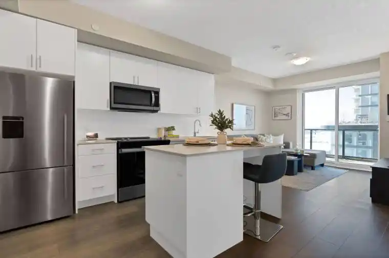 Welcome to Unit 1304 at Branthaven’s award-winning Oakville Condos – a brand-new, bright and airy 1-bedroom suite with 9-ft ceilings, afunctional open-concept layout, and an oversized balcony offering unobstructed green space and sunset views. The upgraded kitchen features quartz countertops, white cabinetry, a tile backsplash, under-mount sink, island with electrical, and high-end stainless steel appliances including a Fisher & Paykel fridge. Premium finishes include wide-plank laminate flooring throughout. The bathroom features a modern vanity. Additional highlights include a walk-in closet and a full-size front-load washer and dryer in a tiled laundry closet. Ideally located on the same floor as the amenities, this stunning unit includes parking and a locker and is conveniently situated just minutes to grocery stores, hospital, schools, and GO Transit, with quick access to Highways 407, 401, and 403.
