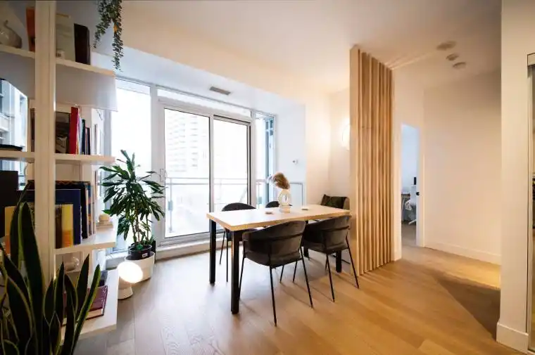 Thoughtfully renovated and easy to live in, this waterfront condo offers a refined take on first-time ownership for a single buyer or young couple who value both function and design.The open living space is anchored by new hardwood flooring, bringing warmth and cohesion throughout the unit. Just off the main living area, a dedicated dining room features a custom dining table with integrated seating and architectural wood paneling, creating a stylized, intentional space you rarely find in condo living. It’s ideal for hosting, working from home, or enjoying everyday meals in a setting that feels more like a home than a typical condo layout.The kitchen is clean, practical, and well laid out, offering generous counter space and storage while maintaining a clear separation from the dining area. The living room comfortably accommodates a full seating arrangement and opens to the balcony, extending the space and bringing in natural light.The bedroom is well proportioned and thoughtfully separated for privacy, complemented by a custom walk-in closet designed to maximize storage and organization. Every renovation feels purposeful, resulting in a move-in-ready home that balances comfort with character.Outside your door, the waterfront lifestyle completes the experience. Enjoy runs or bike rides along the lake, nearby parks for your dog, easy access to TTC and transit, quick connections to Billy Bishop Airport, and a 15 minute walk to King West.For first-time buyers, this is a home that feels considered, comfortable, and well located, offering both lifestyle and long-term value in one of Toronto’s most connected waterfront communities.