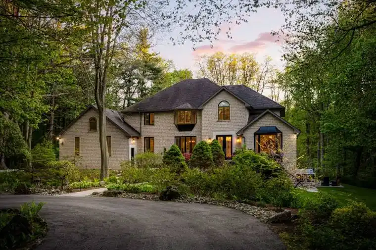 Experience unparalleled luxury in this fully renovated, nearly 7,000 sqft custom-designed executive home on a stunning 2.5-acre property in one of Ancaster’s most exclusive enclaves. Surrounded by nature yet minutes from city conveniences, this home blends upscale living with serene privacy-you have to see it to believe it. New stone walkways and lush greenery create exceptional curb appeal. Inside, every detail has been meticulously crafted to maximize space and functionality. Upon entering, you’re immediately captivated by the grand ‘Scarlett O’Hara’ staircase. The main level boasts formal living and dining areas, a private office, and two powder rooms. The spacious custom laundry/mudroom features garage access and a second staircase to the basement. The elegant family room is a true focal point, with a Valor gas fireplace and a stone feature wall. The gourmet eat-in kitchen is equipped with top-of-the-line appliances, custom cabinetry, granite countertops, and stone accents. Rich hardwood, marble tiles, and high-end fixtures flow throughout. Upstairs, the primary suite is a private oasis featuring a spa-inspired 5-piece ensuite with a curbless glass shower and a deep soaker tub, as well as an expansive walk-in dressing room with custom built-ins. Three additional bedrooms and two beautifully updated baths complete the upper level. The newly renovated walkout basement is the ultimate entertainment hub, offering a fifth bedroom, full bathroom, and a stylish kitchenette or wet bar. Relax in the media area with a Valor fireplace or workout in the state-of-the-art gym. Step outside to a private patio with a hot tub-perfect for unwinding in nature. This level also offers excellent in-law suite potential. Outside, serene ponds and breathtaking views create a peaceful, cottage-like atmosphere. A multi-tiered deck extends the home’s living space, ideal for dining and entertaining. The expansive yard completes this one-of-a-kind luxury retreat.