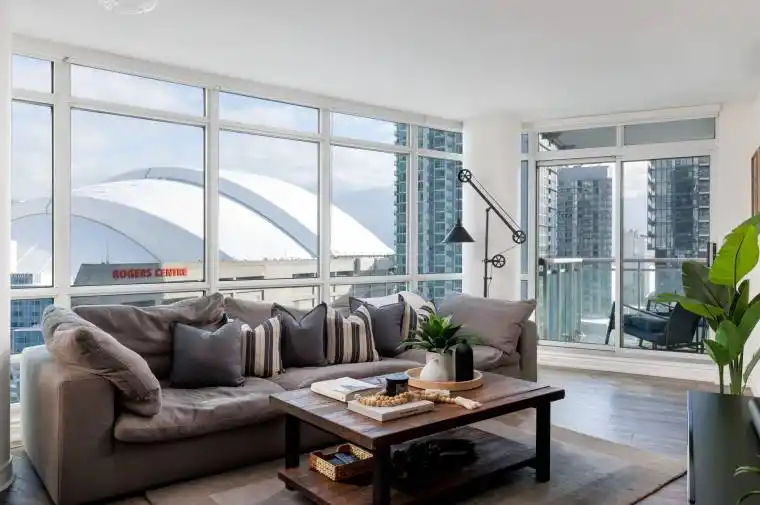 With 34 feet of wraparound floor-to-ceiling windows and unobstructed views of the CN Tower and Rogers Centre from every angle, unit 1908 at 381 Front St. W. offers a truly one-of-a-kind downtown living experience. This 1+1 bed, 1 bath, corner suite offers 733 square feet of living space and a highly functional layout, thoughtfully separating the sleeping quarters from the kitchen and main living and entertaining areas. Custom updates throughout include German-engineered commercial-grade laminate flooring (2023), Alexandria 5″ baseboards and shoe moldings, and generous built-in storage with IKEA PAX systems in both the den and bedroom. The updated kitchen and bathroom showcase a contemporary design, featuring quartz countertops, soft-close cabinetry, custom hardware and fixtures, along with many additional enhancements (see the attached feature sheet for a complete list of upgrades and finishes). This property includes one owned parking space and one oversized locker, plus access to an exceptional suite of building amenities: 24-hour concierge service, a totally revamped fitness centre with state-of-the art workout equipment (just opened February 2026), indoor pool with whirlpool and sauna, a multi-purpose sports court (basketball, badminton, pickleball, volleyball), theatre room, billiards lounge, party room, and a landscaped rooftop garden with BBQ terrace. Located in the heart of the Entertainment District, 381 Front Street places you just steps from Toronto’s most recognized landmarks including Rogers Centre and the CN Tower – along with transit, everyday conveniences, acclaimed dining, and exciting new developments such as The Well, an impressive mixed-use development of diverse dining options, retail shops, fitness and entertainment. Discover everything unit 1908 at 381 Front St. W. has to offer – and experience downtown living at its best.