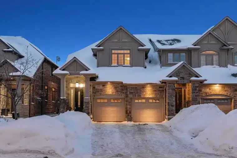 A truly rare offering in one of Waterloo’s most coveted neighbourhoods. Welcome to 155 Oak Park Drive, a stunning, custom-built freehold executive end-unit townhome backing directly onto parkland w/ no rear neighbours, offering exceptional privacy, & 3,400+ SF of finished living space. Offering 4 bedrms & 4 bathrms across 3 fully finished levels, this home stands apart for its size, layout, & privacy-a combination seldom found in Carriage Crossing. The main level impresses immediately, anchored by a dramatic 2-storey great rm w/ gas fireplace & a striking wall of windows overlooking the private, tree-lined backyard, filling the home w/ natural light. The updated kitchen (2022) is elegant & thoughtfully laid out, featuring a lrg centre island, premium appliances, quartz counters, glass herringbone backsplash, & a dedicated bar/servery area. The kitchen flows naturally into the adjacent dining rm, ideal for everyday meals & more formal gatherings, w/ direct access to the covered back porch, patio, & yard for seamless indoor-outdoor living. A 2-pce bath & laundry/mud rm completes the main. Upstairs, the primary suite features vaulted ceilings, dual walk-in closets, & a spa-like 4-pce ensuite w/ dual sinks & tiled glass shower. 2 additional bedrms & a 4-pce main bath w/ tub/shower combo complete the upper level. The finished basement adds versatility, w/ lrg rec rm, 4th bedrm, office/den, 3-pce bath w/ shower, & excellent storage-well suited for a future in-law/guest suite, multi-generational living, or a home office. Beautifully landscaped w/ spectacular curb appeal, featuring 2 separate garage doors & parking for 4 vehicles. Enjoy a covered back porch, expansive patio w/ hot tub, & a completely private backyard-perfect for outdoor entertaining, summer evenings, & quiet enjoyment year-round. Steps to trails, Grey Silo Golf Club, Carriage Crossing Plaza, & top-rated schools, w/ easy access to universities, tech campuses, & major HWY’s. This home won’t last!