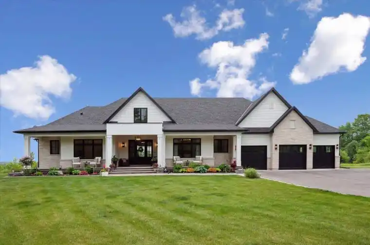 Custom-Built Luxury Bungalow on 2.4 Private Acres with Escarpment Views. Welcome to this one-of-a-kind custom-built bungalow offering 3,400 sq. ft. of refined main floor living space, perfectly nestled on 2.4 acres of serene countryside. With panoramic views of the escarpment and set well back from the road, this residence offers exceptional privacy while being just 20 minutes from the 401. Designed with luxury and functionality in mind, the home boasts soaring ceilings and oversized windows, creating an expansive, airy ambiance throughout allowing the natural landscape in and flooding the home with light. The main level features a seamless open-concept layout anchored by a great room and primary bedroom with oversized sliding doors opening to an extended outdoor living space with a two sided fire place, hot tub, and an abundance of entertaining space. The heart of the home is a chefs dream kitchen outfitted with top-tier Wolf, SubZero, and Cove appliances, complemented by a stylish servery just off the formal dining room. Retreat to the spacious primary suite, a true sanctuary offering an oversized spa-inspired ensuite complete with heated floors, a large walk-in shower, water closet, luxurious soaker tub, dual sinks with an extended vanity, and a generously sized walk-in closet. Two additional bedrooms on the main floor each enjoy their own private ensuites. Downstairs, the wow factor continues. The 10-foot ceilings and expansive windows make the finished basement feel anything but below grade. Designed for versatility, the lower level includes a full gym, sauna, and a private entry from the oversized 3-car garage making it perfect for an in-law suite. This separate living space features a bedroom, full bath, and kitchenette with a fridge, sink, and microwave. Every detail has been thoughtfully considered. Truly, this is a rare opportunity to own a stunning estate home where luxury, privacy, and convenience converge.