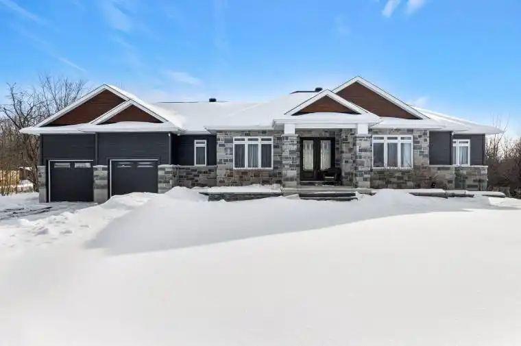 Elegant walkout bungalow built in 2022, with impressive balance of architecture style and modern contemporary design. Front Cortona stone with accents of quality Maibec wood siding both complement each other while blending into the surrounding two acres. Front porch graciously welcomes you with set of beveled glass doors that open into big bright foyer and double closet. The open floor plan is a palette of calming soft colours and full of natural light flowing in from all the tall windows. Modern hardwood, luxury vinyl and ceramic flooring through this spacious 3+2 bedroom, 3.5 bathroom home. Living room has showcase recessed shelving next to propane fireplace that is the ideal gathering place for family and friends. Dining area defined by attractive drop ceiling plus wrap-around windows and patio doors to deck. You’ll love the kitchen with its two-tone cabinetry, gold-accent hardware, quartz countertops and subway tile backsplash; grand chef island-breakfast bar fits 4-5 comfortably. Primary suite retreat includes quality blackout curtains and full wall of closets; luxurious ensuite quartz vanity, makeup nook, touch-light mirrors, soaker tub and glass shower with luxury body-spa showerhead. Two more large bedrooms. Main bathroom quartz vanity, touch-light mirror and clock display; shower has exotic tile and body-spa showerhead. Main floor laundry room with cabinets and window. Lower level features luxury vinyl floors and pot lights. Rec room patio doors open to outdoors. Family room has area for entertainment centre. Den provides flex space, could be hobby room or office. Lower level also has two more bedrooms; one includes walk-in closet. Lower level 3-pc bathroom quartz vanity, touch-light mirror and soaker tub, Both lower and main floors access attached double garage with its storage loft and yard door. Architectural roof shingles. And, under Tarion warranty. Located on township paved road with school bus pickup. Hi-speed and cell service. 10 mins to Perth.