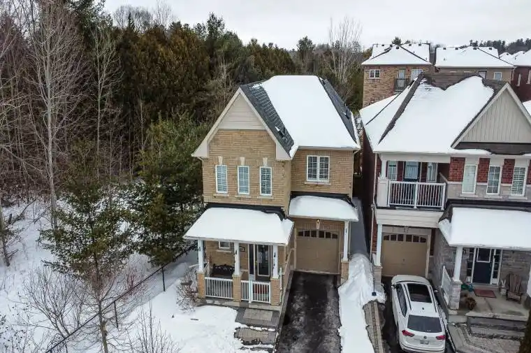 ** Sold Conditional, showings still welcomed ** Tucked at the end of a quiet cul-de-sac, this end-lot detached sits beside the ravine with no neighbour to the west. The west side and backyard are wrapped in treeline and conservation, creating a true sense of retreat, where your daily view is greenery, birdsong, and sunset light filtering through the canopy. Curb appeal begins with an interlocking walkway framed by two interlocking flower beds. Out back, the lifestyle is the headline: step onto a generous deck with a pergola set against the forest edge. Entertain with a gas BBQ connection, gather around the gas fire pit, then unwind in the Arctic Hot Tub Swim Spa, all while the ravine and treeline deliver privacy you can feel. Thoughtful native plantings and trees invite monarchs and songbirds, while an outdoor pot light system extends the atmosphere into the evening. Inside, the main level offers a formal dining room with hardwood floors, a vaulted ceiling, pot lights, and a large window overlooking the trees. The open-concept kitchen features a wrap-around counter, tile backsplash, ceramic flooring, and a bright breakfast area with a walkout to the deck (glass door with shutters) plus a west-facing window to the ravine. The living room is warm and light-filled with a gas fireplace, hardwood, and large windows on two sides. Upstairs, an open study/loft with hardwood provides flexible work-from-home or lounge space. Bedrooms are generously sized with excellent closet storage. The primary suite impresses with a spa-like ensuite (soaker tub, glass shower, double vanity, separate toilet) and a custom built-in closet system. Second-floor laundry for added convenience. Finished basement includes two rooms and a 3-piece bath; currently used as a guitar/wood workshop. Equipment may stay or be removed. Minutes to Seaton Centre shops, banks, cafés, dining, trails/green space, and Pickering Golf Club.