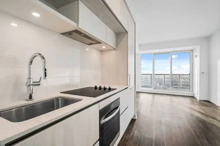 At 573 sf with 121 sf of outdoor space and 9 ft ceilings, this suite is efficiently laid out with a clean, linear confidence. The living area feels airy and composed and opens into the kitchen where you’re met with pale wood millwork, integrated appliances, quartz surfaces, and soft under-cabinet lighting that reads more art gallery than condo. Light pours in and pools across wide-plank floors, softening the clean lines and warming the modern finishes. The bedroom is bright and serene, framed by a large window and enough space to breathe – ideal for someone who values rest as much as momentum. The balcony extends the living area outward with an open view , perfect for slow morning coffee or extended evenings. The entire home feels considered, uncluttered, and easy to keep that way. This home is for you if you live deliberately, edit your life carefully and prefer quality over accumulation.