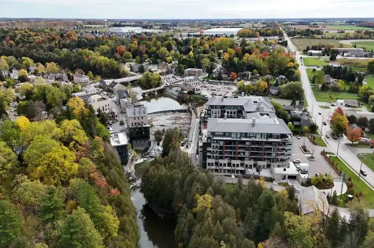 This Luxury suite was designed for those looking to downsize without compromise. 2,098 Sqft of thoughtfully designed living space, this stunning first-floor residence combines the ease of Condo Living with the space and comfort of a Detached Home. This open concept layout has incredible flexibility, allowing you to tailor the space to suit your needs. The expansive dining area comfortably accommodates a full sized dining table, perfect for hosting dinner parties or cherished family gatherings, with room to bring your heirloom set. The living room is ideal for entertaining or relaxing with multiple seating areas and direct access to a sprawling 247 sqft Terrace, perfect for outdoor dining or enjoying your morning coffee. The designer kitchen, complete with an oversized island, with seamless integration into the living and dining areas. Tucked away the primary suite is a true retreat, accessed by a separate hallway and features a spa-inspired ensuite bath and generous walk-in closets. A second spacious bedroom, ideal for family or guests with a large closet & the 3rd bonus room provides added versatility, easily used as a home office, media room or even a 3rd bedroom for visitors. The full-size laundry room offers additional storage and convenience. Located on the ground floor, this suite offers direct views of the Terrace and across the river to the Elora Mill. Perfect for pet owners or those who prefer to avoid elevators. Start your mornings with a short stroll to the resident lounge to enjoy coffee and fresh pastries from the Elora Mill. This suite includes one underground parking space, a locker, and offers access to resort-style amenities: Fitness centre, Yoga studio, Lounge and Lobby Coffee Bar, Outdoor Terrace, and a Pool with Spectacular River Views!! Experience refined living in one of Ontario’s most charming and walkable communities. Just steps away from award winning restaurants, artisan shops, cafes and the natural beauty of Elora.