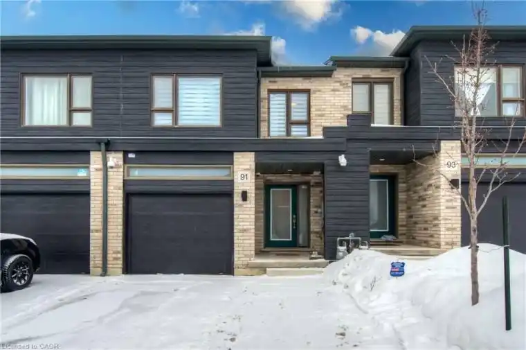 Welcome to 91 Pony Way. This beautifully maintained modern freehold townhouse is nestled in the sought after Huron Park neighbourhood and offers the perfect blend of style, comfort, and functionality. This two storey home features three spacious bedrooms and is ideal for first time buyers, savvy investors, or anyone looking to downsize without compromising on space. The main floor showcases durable vinyl flooring throughout and a bright open concept layout designed for everyday living and effortless entertaining. The kitchen is the heart of the home, complete with a large island and sleek stainless steel appliances, flowing seamlessly into the living and dining area. From here, enjoy views of the backyard and step out onto the finished deck, perfect for relaxing or hosting summer gatherings. Upstairs, the generous primary bedroom offers a walk in closet and a private four piece ensuite bathroom. Two additional well sized bedrooms and another four piece bathroom provide plenty of space for family or guests. The partially finished basement already has framing completed and electrical wiring run throughout, offering a fantastic opportunity to customize and add value. With parking for three vehicles including a single car garage and a driveway that fits two cars, this home truly checks all the boxes. A stylish, move in ready opportunity in a fantastic family friendly community.