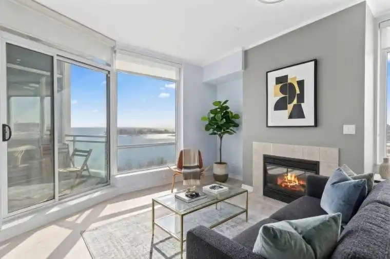 Lakefront Living At Grenadier Landing! Bright south-facing suite offering beautiful lake views in a highly sought-after waterfront community, enjoyed from the living room and private balcony. Upgraded modern kitchen with stainless steel appliances & cozy gas fireplace in the sun-filled living area. Spacious bedroom with California shutters & ample closet space. Wide plank flooring throughout. Includes parking & locker. Maintenance fees include utilities. Well-managed building with excellent amenities including concierge, gym, party room, guest suites, visitor parking & outdoor deck. Located in the vibrant Mimico waterfront community, steps to parks, scenic trails, the lake, shops, restaurants, grocery stores & transit with easy access to downtown. A perfect blend of nature and city convenience.Some photos have been virtually staged.
