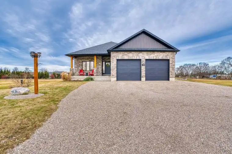 Sitting on a tranquil 1/2 acre lot in desirable Port Albert, walking distance to sandy beach with awesome sunsets. Well maintained bungalow built in 2019 with an additional detached garage. This home features 9 feet ceilings, hard wood flooring through out, open concept kitchen with stainless steel appliances and quartz counter tops, living room has walk out to 35’x12′ covered deck perfect for entertaining or relaxing by your outdoor firepit, lots of room to grow. Master bedroom has ensuite, walk in closet and additional walk out to covered deck, convenient main floor laundry. Basement has 8 foot ceilings, outer walls are all insulated and studded, ready for electrical and drywall, roughed in 3 piece bath with sewage tank, roughed in central vac, forced air furnace heat supplied by a boiler (very efficient) and heated basement floor. Detached garage is insulated ,walls are covered in plywood and has forced air propane heater with thermostat, 240 volt shop receptacle and Wi-Fi connection. Ample parking for 12 cars or some toys. Short drive to hiking trails, swimming beaches, fishing, snowmobiling, shopping and much more.