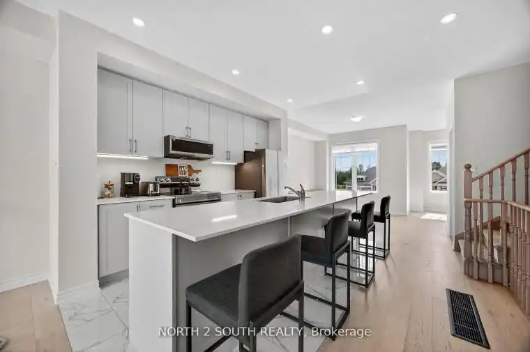 Stunning 3-storey townhouse with over $40,000 in upgrades + TESLA charger! Bright, modern layout with laminate throughout, upgraded tile, oak stairs, custom window coverings & pot lights on all 3 levels. Main-floor rec room, open-concept second level with a 10′ x 18′ deck overlooking the golf course, plus 2nd-floor laundry. Primary bedroom with W/I closet & upgraded 4-pc ensuite. Parking for 3, central A/C, interior garage access & ample storage. Located on an 18-hole golf course with a future park coming. Close to the beach, marinas, entertainment, shopping, nearby parks, several golf courses & lots of extra parking. Minutes to Beach 1, Walmart, restaurants, new rec complex, library & future high school. Move-in ready!
