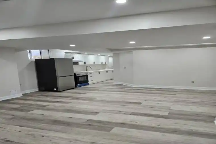 Brand new 2-bedroom basement apartment with private separate entrance. Features higher-than-standard ceilings (approx. 8 ft+) creating a bright and spacious feel, complemented by 5 large windows that bring in plenty of natural light. Modern kitchen with quartz countertops and brand-new stainless steel appliances. Bathroom also finished with quartz countertop. Unit includes 5 new appliances: fridge, stove, washer, dryer, and range hood. One parking spot included. Tenant responsible for 30% of household utilities. Clean, modern, and move-in ready.