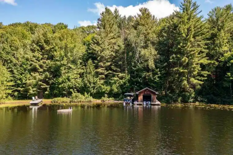 OUTSTANDING WATERFRONT COTTAGE RETREAT ON SPRING FED OTTER LAKE! 6.3 ACRES OF PRIVACY! 340 ft of Private shoreline, Natural sand beach entry, Rare wet boathouse, Lovingly cared for 3 bedroom, 2 bath cottage, Walkout to 2 desirable screened-in sunrooms nestled amongst the pines, Cedar Enhanced Great room featuring vaulted ceilings & Captivating floor to ceiling stone fireplace, Cottage bungalow boasts 3 bedrooms, 2 baths (2nd bath just redone by Northern Kitchen, Living & Bath), Delightful Updated Bunkie with private guest room & 2 pc bath, Full block perimeter foundation makes this a solid lake house, Potential to be wonderful year-round retreat by installing a 4 season water system, Cottage is heated and insulated to extend spring and fall enjoyment, Private road that is kept open year-round for a shared fee, Detached garage with hydro, Convenient circular drive. RARE WET BOAT HOUSE includes Doral Ski Boat, This is truly a CLASSIC TURNKEY COTTAGE nestled amongst the pines, Quiet Cove, Private Paradise on desirable Otter lake!