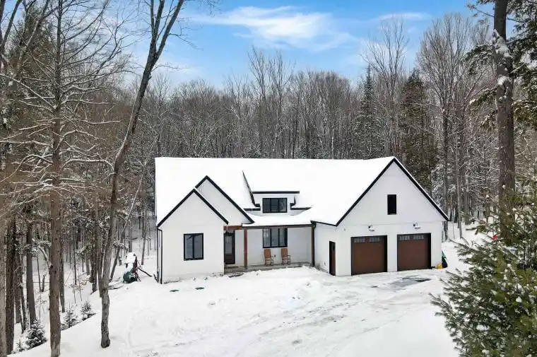 Built in 2021, this stunning modern home sits on a quiet cul-de-sac in the village of Haliburton. Soaring cathedral ceilings, white shiplap detailing, and a dramatic wall of black-framed floor-to-ceiling glass doors create a bright, airy great room anchored by a stacked stone fireplace with reclaimed wood mantle – warm, stylish, and made for gathering, while the covered rear deck with timber posts and glass railings brings the outdoors in. The Pinterest worthy chef’s kitchen delivers on every detail: Stone countertops and backsplash, a gas range, white shaker cabinetry with brass hardware, and a large island with seating perfect for entertaining. The walk in Coffee nook in the kitchen is practical and charming with antique stained glass wood doors and additional storage. The primary suite is a true retreat, featuring a spa-inspired ensuite with freestanding soaker tub, double vanity with gold fixtures, and a generous walk-in closet. Two additional well-appointed bedrooms and two beautifully finished bathrooms round out the upper level. Entering from the attached double garage, a functional mudroom and laundry room with dark built-ins add everyday ease. The private backyard backs onto mature trees and a flowing creek with plenty of room to roam. The finished walkout basement expands the living space significantly – offering a rec room, home office, and gym plus patio to the backyard with seating and hot tub. And for the ultimate year-round indulgence, this exceptional home also features its own private in-home sauna in the tastefully styled basement bathroom. Homes like this don’t last – call today to book your private viewing before it’s gone.