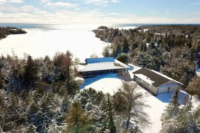 EFFICIENT 4-season COTTAGE or HOME on 3/4 ACRE of PRIME LAKE HURON WATERFRONT in the desirable Warner Bay / Eagle Harbour area on the Bruce Peninsula. Offering MODERN CONVENIENCES … forced air furnace (new 2018), CENTRAL AIR (new 2018), HRV air-exchanger, propane GAS FIREPLACE. PRIMARY BEDROOM W/ENSUITE & walk-in closet & water views & walkout to patio. EFFICIENT 1382 SQ FT of open design living space, CUSTOM KITCHEN w/island + built-in appliances, GREAT ROOM w/2 patios doors & water views, 3 BEDROOMS (2 with water views & walkouts), 2 full bathrooms, 360 degree wrap-around covered deck. ADDITIONAL 336 SQ FT LIVING SPACE – FINISHED & HEATED BUNKIE with PATIO DOORS & WATER VIEW for a 4th bedroom, office, entertain room or guest suite! Oversized & insulated DOUBLE GARAGE to store toys and large circular driveway. Property being SOLD TURN-KEY with ALL FURNISHINGS INCLUDED, plus extras BBQ, KAYAK, CANOE, GENERATOR, SNOWBLOWER all included!! Over 111ft of PRIVATE SHORELINE featuring gentle, flat rock entry for CRYSTAL CLEAR WATER for swimming and water-sports. West-facing, secluded cove boasts sunset views & idyllic protection from large open-water waves. PROFESSIONALLY LANDSCAPED, LOW MAINTENANCE property offers MORE TIME for FUN & EXPLORING the miles of area shoreline inlets by kayak, canoe or seadoo … TOBERMORY is a 15min SEADOO or DRIVE to shopping or lunch, snorkelling wrecks, HIKING the BRUCE TRAIL / cliff jumping at the GROTTO. Or just RELAX at your cottage listening to the waves & taking in the FAMOUS LAKE HURON SUNSETS!