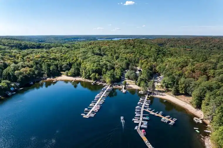 If you are looking for a large property to share and enjoy with family and friends, Oakview Lodge is a must see! Nestled on the shores of Little Hawk Lake, this 7000+ sq ft lodge has been updated to combine rural charm with modern amenities. The main floor consists of 2 smaller and 1 large lounge area with a large island, beverage station and a central stone fireplace. Also on this floor is the main dining area, 2 washrooms and a well-equipped kitchen with 2 new induction stoves. The large pantry/laundry room off of the kitchen leads to a rear screened porch that ensures you can BBQ year-round. Wrapping around the front and side of the lodge is a large 3-season screened porch allowing you to dine and relax while overlooking the lake. The second floor has 6 separate bedrooms, each with their own ensuite and some with private sitting areas. Off of the second floor, is a tiered deck that provides a peaceful outdoor space to enjoy, and leads to the recently landscaped garden with raised beds, perennial gardens and a firepit to gather around. The third floor is a 3-bed luxury unit. With its own washer/dryer off of the large master bedroom, a 4-piece bath, an open-concept living/kitchen/dining area with a large granite island and an attractive propane fireplace, it is completely self-contained. Also on the property is a fully contained 4-season, 2-bed guest house, and a large garage/workshop, with a second floor studio space. Should you choose to occasionally embrace the cottage rental market, this income, combined with income generated by the property’s fully leased out dock and parking lot, has the potential to offset many of your property expenses. Marine activities can easily be outsourced with a marina services partnership. Whether you enjoy participating in a variety of outdoor activities, embracing a thriving arts community, relaxing fireside, or simply gathering with family and friends, this property in the Algonquin Highlands has something to offer you!